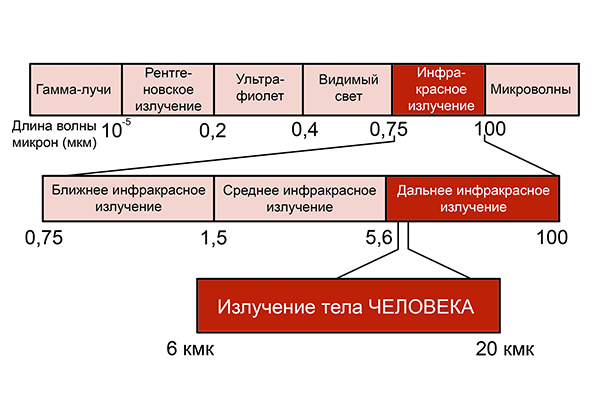 - Длинноволновые инфракрасные волны безопасны для человека. Их источником являются нагретые твёрдые предметы. Тело человека также является источником длинноволнового инфракрасного излучения (длина волны – 6-20 мкм). Существуют некоторые минералы (например, нефрит, турмалин), которые при нагревании излучают очень похожие по спектру волны. Длинноволновое инфракрасное излучение беспрепятственно проникает внутрь человеческого тела на глубину до 7 см.