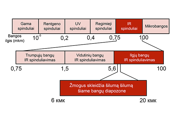 Infraraudonųjų spindulių bangos ilgis – didelis, o dažnis – mažas. Jie nematomi žmogaus akiai ir suvokiami mūsų kūno odos šilumos receptoriais. Infraraudonųjų spindulių šaltiniai – tai įvairūs įkaitę objektai, o šių spindulių savybės priklauso nuo įkaitusio objekto savybių.