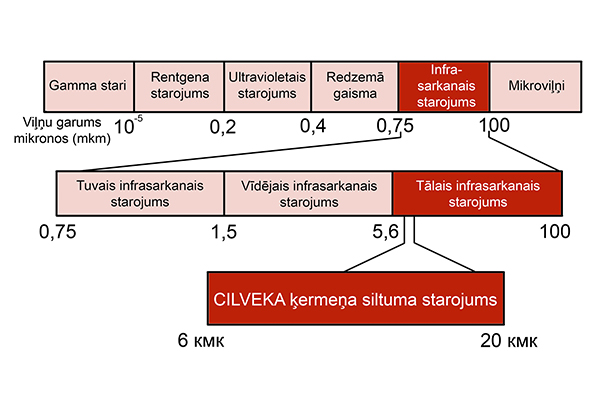 - Garie infrasarkanie viļņi ir droši cilvēka organismam. To avots ir uzkarsēti cieti priekšmeti. Arī pats cilvēka ķermenis izdala garo viļņu infrasarkano starojumu (viļņa garums ir 6-20 µm). Pastāv daži minerāli (piemēram, nefrīts un turmalīns), kuri uzsilstot spektra ziņā izstaro ļoti līdzīgus viļņus. Ilgviļņu infrasarkanais starojums bez grūtībām iekļūst cilvēka ķermenī līdz pat 7 centimetru dziļumā.