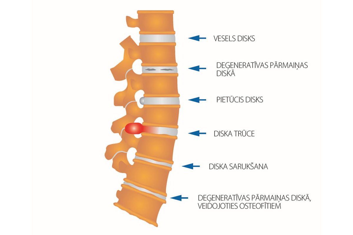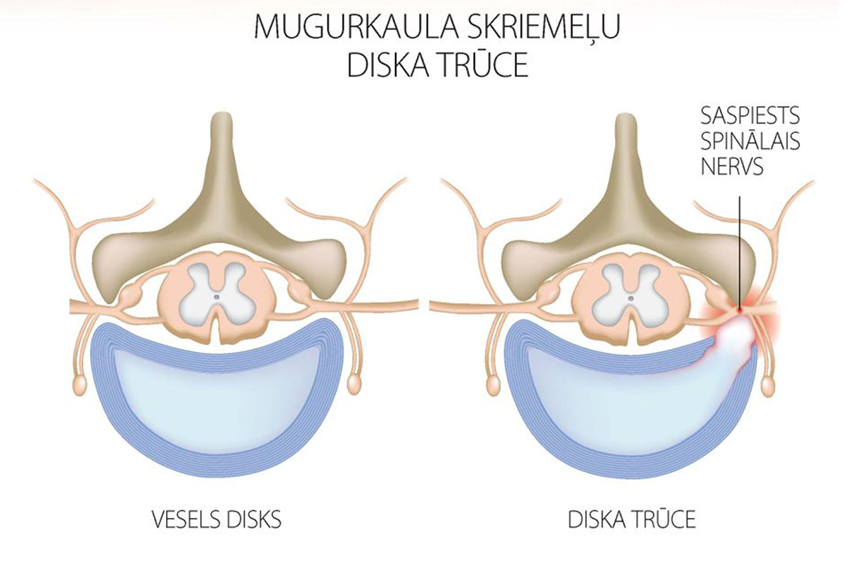 Kad mugurkauls tiek noslogots, starpskriemeļu diski tiek nospiesti. Ja disks zaudē savu elastību, tad daļa diska iziet ārpus mugurkaula robežām, un veidojas diska trūce. Trūce nospiež nervu saknītes, un līdz ar to rodas sāpes un nervu saknīšu funkciju traucējumi. Kad nervu saknītes tiek nospiestas, zūd impulsi no smadzenēm uz ķermeņa orgāniem un otrādi. Ja nervu saknītes tiek ilgu laiku stipri nospiestas, orgāni var saslimt un zaudēt savas funkcijas. Bieži vien tieši šī iemesla dēļ attīstās hroniskas slimības.